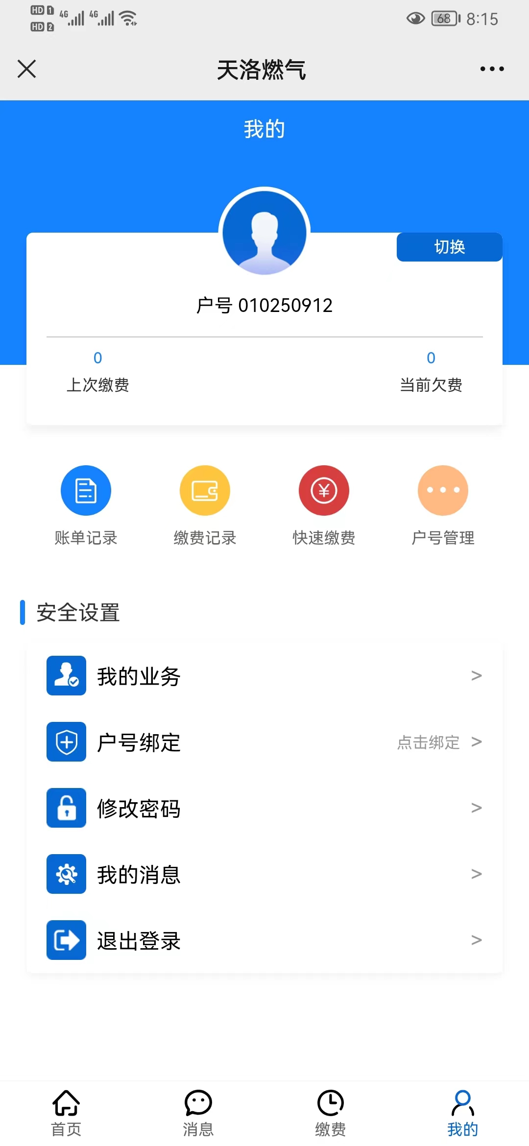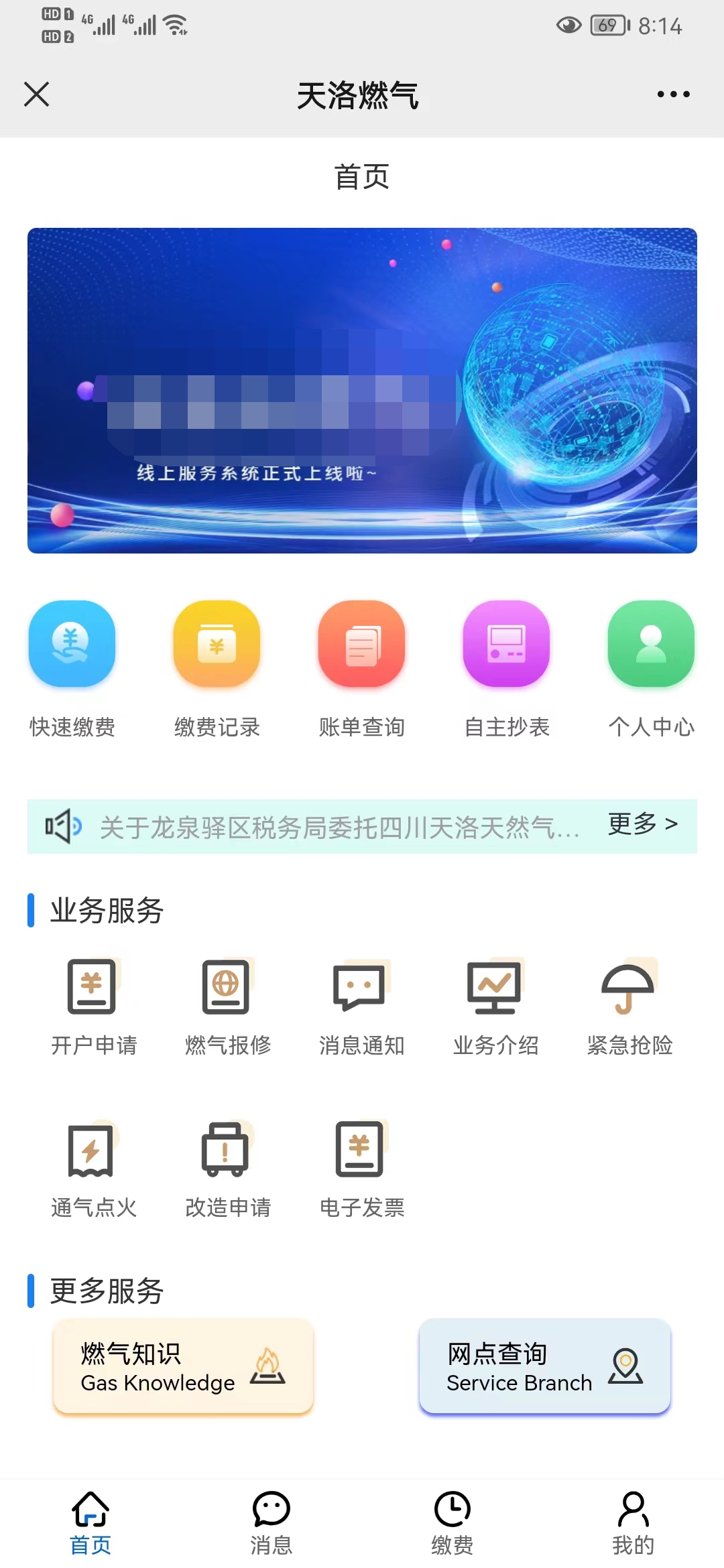 燃气缴费特色服务功能,为用户提供多样化服务,包括快速缴费、缴费记录、账单记录、自主抄表、消息通知、安全宣传、个人中心等。
