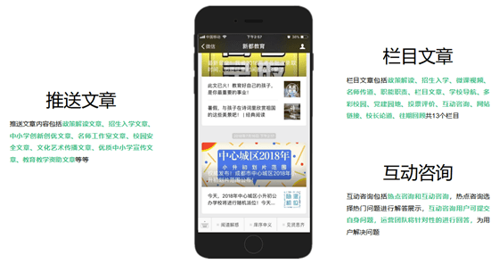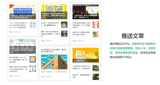 通过微信公众平台,定期向关注“新都教育”的用户推送政策解读、招生入学、优质学校、名师传道等资讯信息,将资讯信息直接发送到用户手机上。