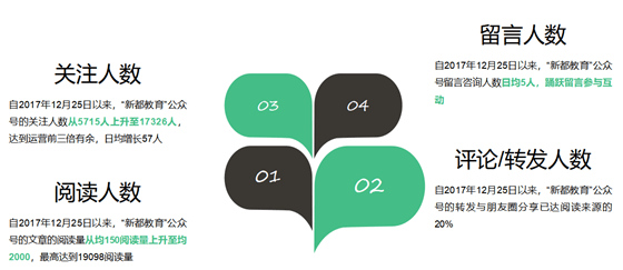 通过各类数据信息的支持,得出新都教育局在使用公众平台建设方式后,得到的优势变化,以及获得的可喜成果及其案例。